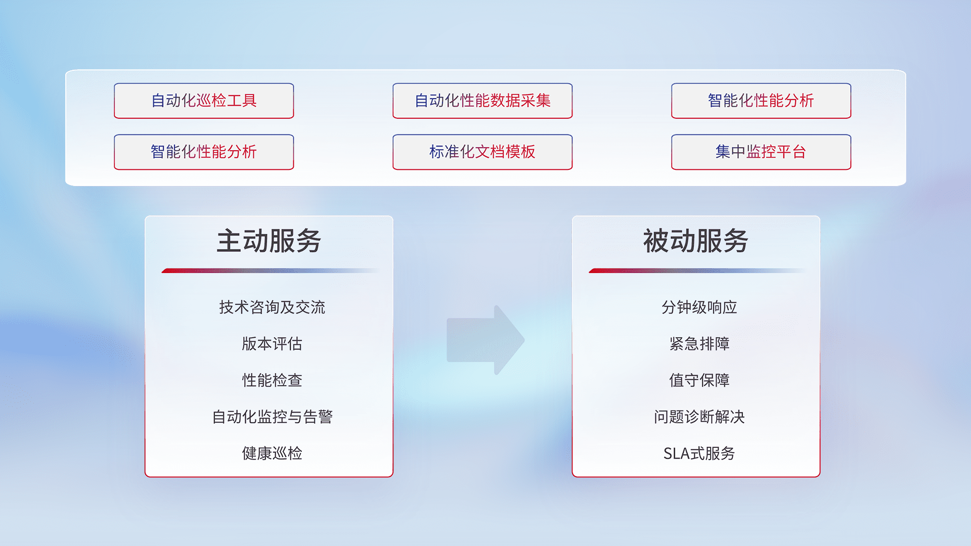 智能化工具和标准化文档,,,保障服务质量,,,,提供主动服务(包含技术咨询、、、版本评估、、性能检查、、、、自动化监控与告警、、、、健康巡检)和被动服务包含(分钟级响应、、紧急排障、、值守保障、、、、问题诊断解决、、、SLA服务)。。。