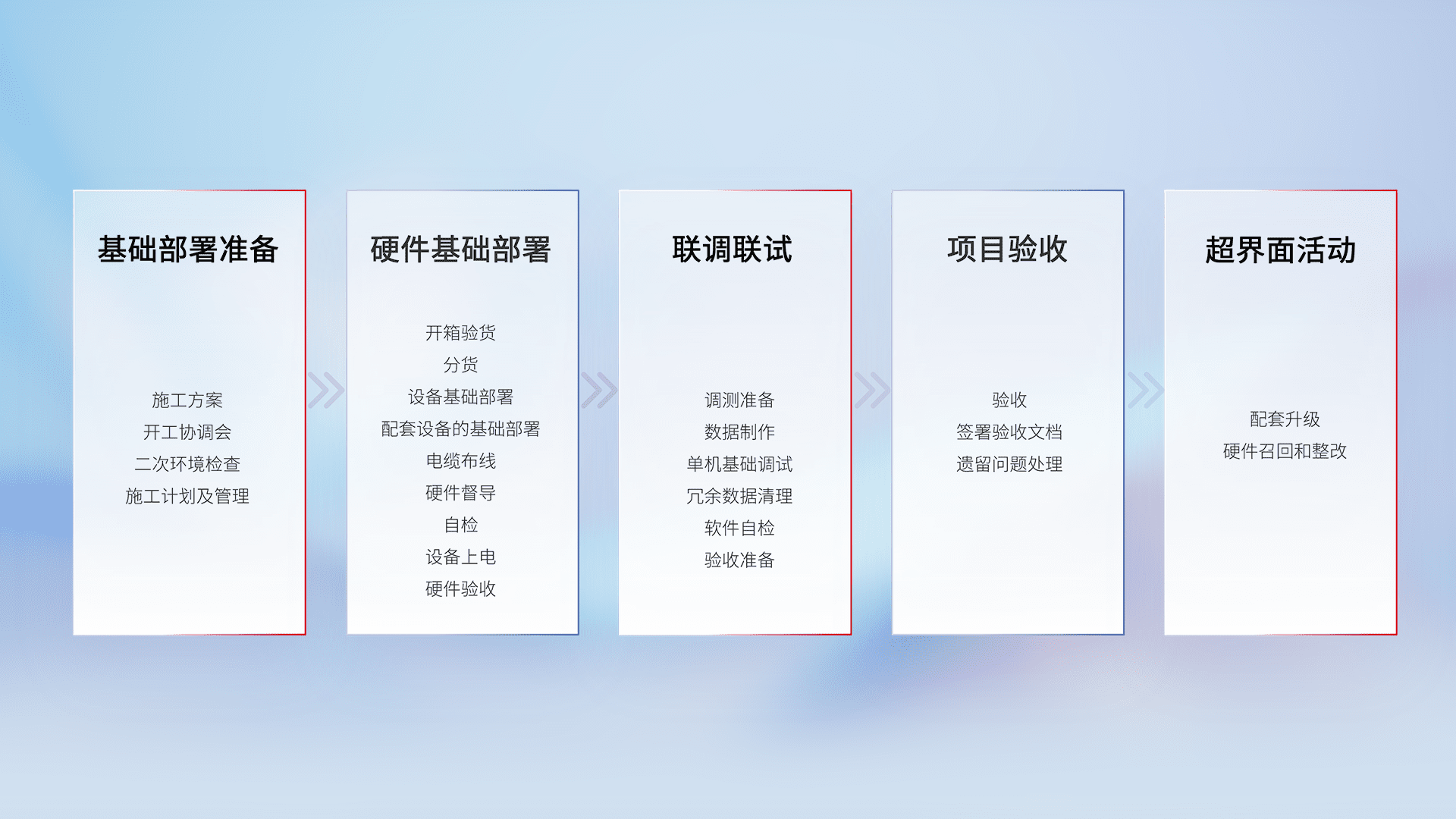从基础部署准备、、硬件基础部署、、、、联调联试、、、、项目验收、、越界面活动的全过程可追溯,,保证施工质量和进度。。
